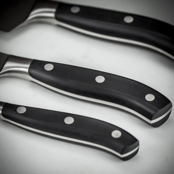 The bolster also prevents your hand from slipping between the handle and the blade. As part of this series, the Grand Maître Chef’s Set is a three-piece collection of essential instruments that, while having different purposes, all share the same core qualities. Comprised of a kitchen knife, carving knife and chef’s knife, this set works as a stand-alone do-it-all kit or as the base for a larger, more developed collection of kitchen tools.