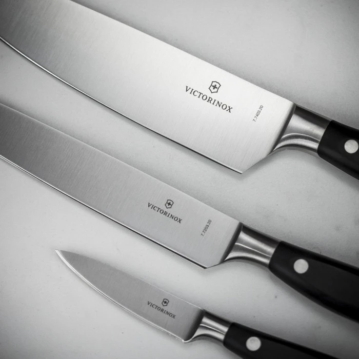 Exceptional quality and timeless elegance are two defining features of the Grand Maître series of forged knives from Victorinox. For which every piece seamlessly transitions from blade to handle with just a subtle thickening of the steel to act as a separating bolster at the point where the two meet.