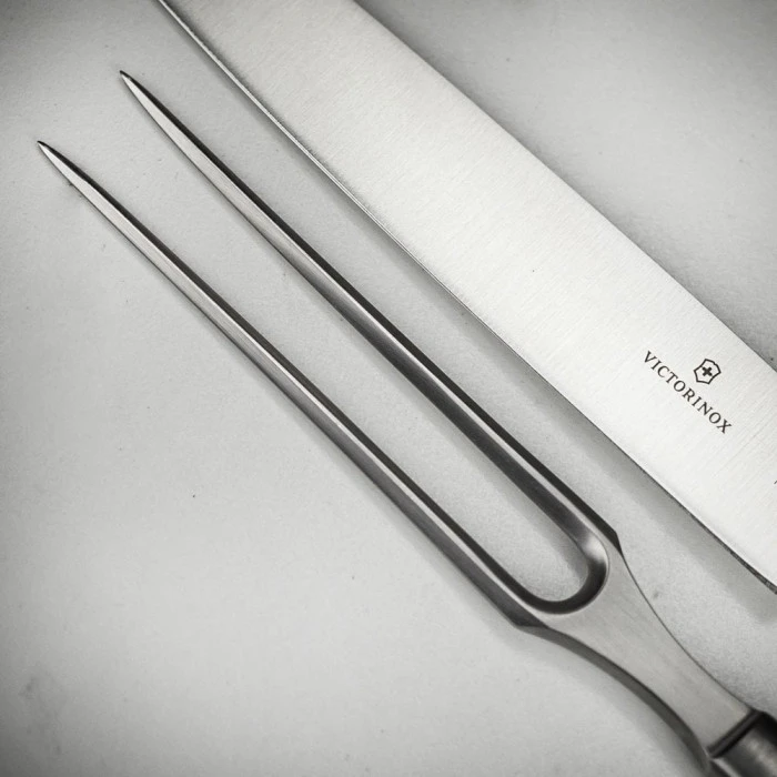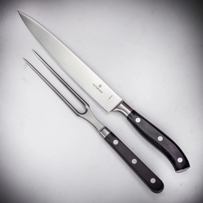 This beautiful and perfectly matched pair is all that’s required by home cooks and professional chefs alike for the neat and efficient carving of joints of meat or fowl. The two pieces of the Grand Maître Carving Set are the Carving Knife and Carving Fork from the Victorinox professional range of full tang forged knives.