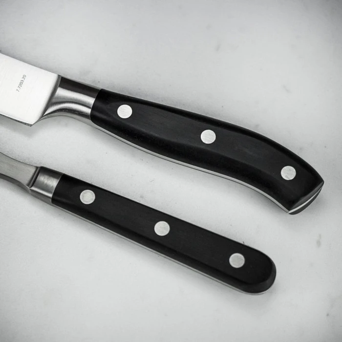 Both pieces feature a handle that is ergonomically designed so that no matter the number of strokes required to serve roasted food, neither will rub nor cause any discomfort. Like all the knives in this range, this Carving Knife and Fork are uniformly hardened and are perfectly balanced.