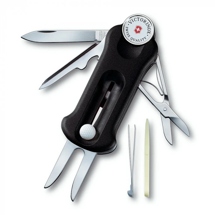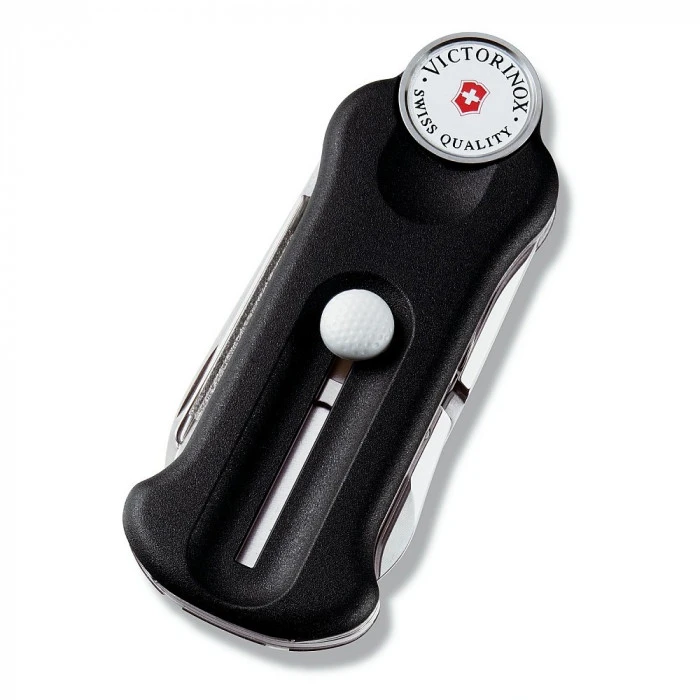 The versatile, high quality golf tool lies pleasantly in your hand and weighs only 64 grams, despite its ten tools. The tee punch for one hand operation is manufactured from thin, hardened steel. It penetrates very easily into the soil without pushing down roots. The tools, which swivel out to the sides, disappear with a slight pressure on the inside of the tool, so that the tee punch is more comfortable to operate. The ball marker can also be pushed out and be directly set into the green with one hand. If the ground is hard or frozen, the hole punch can be used to drill out a hole for setting the wooden tees.