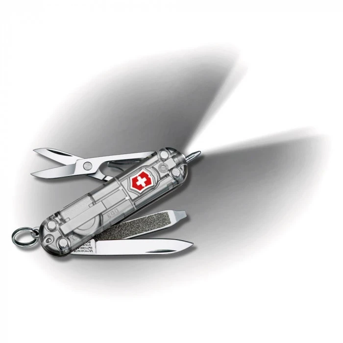 The classic Victorinox Signature design with the addition of a light brought to you in the SilverTech style. With a ballpoint pen and a keyring attachment the Signature Lite SilverTech is with you wherever you go. Add personalised laser engraving for a special gift.