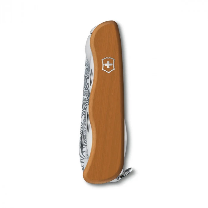 - Swiss made pocket knife crafted in resilient Damasteel with a unique “Baldur” pattern on the large blade